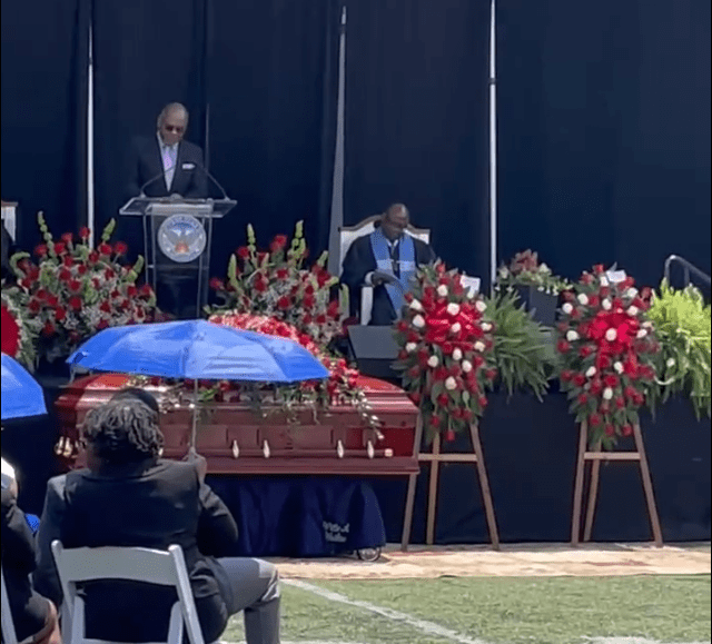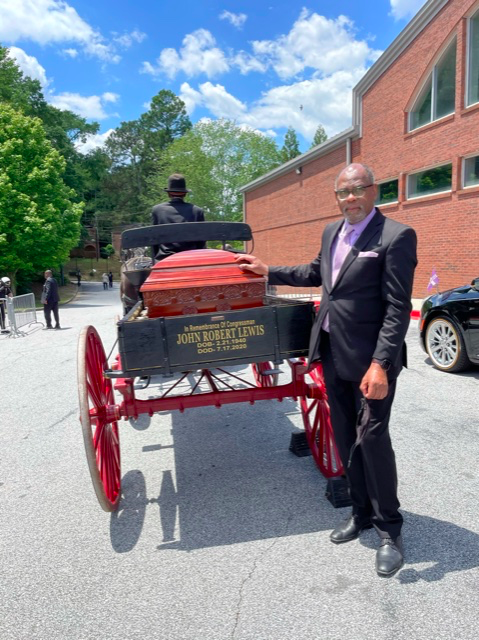 Jabari Simama with coffin of C.T. Martin at his Celebration of Life on May 15, 2021 at C.T. Martin Natatorium and Recreation Center in southwest Atlanta. Coffin rests inside the John R. Lewis wagon